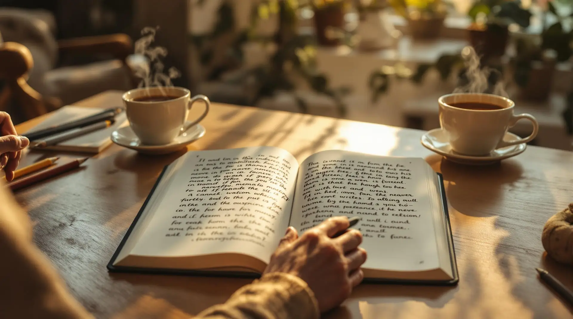 Gentle hands holding warm mug with steam, open journal and reading glasses in cozy nook for emotional journaling practice