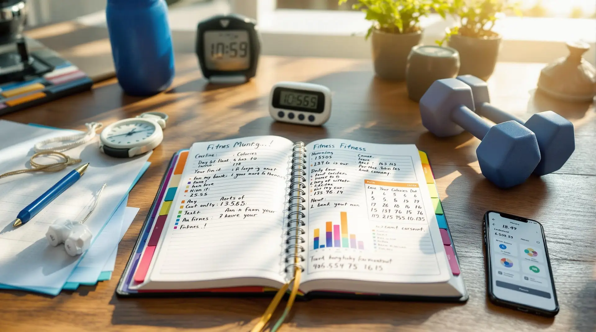 Open fitness journal on wooden desk with handwritten workout tracking, surrounded by exercise equipment and illuminated by morning sunlight, with smartphone displaying matching fitness data nearby.