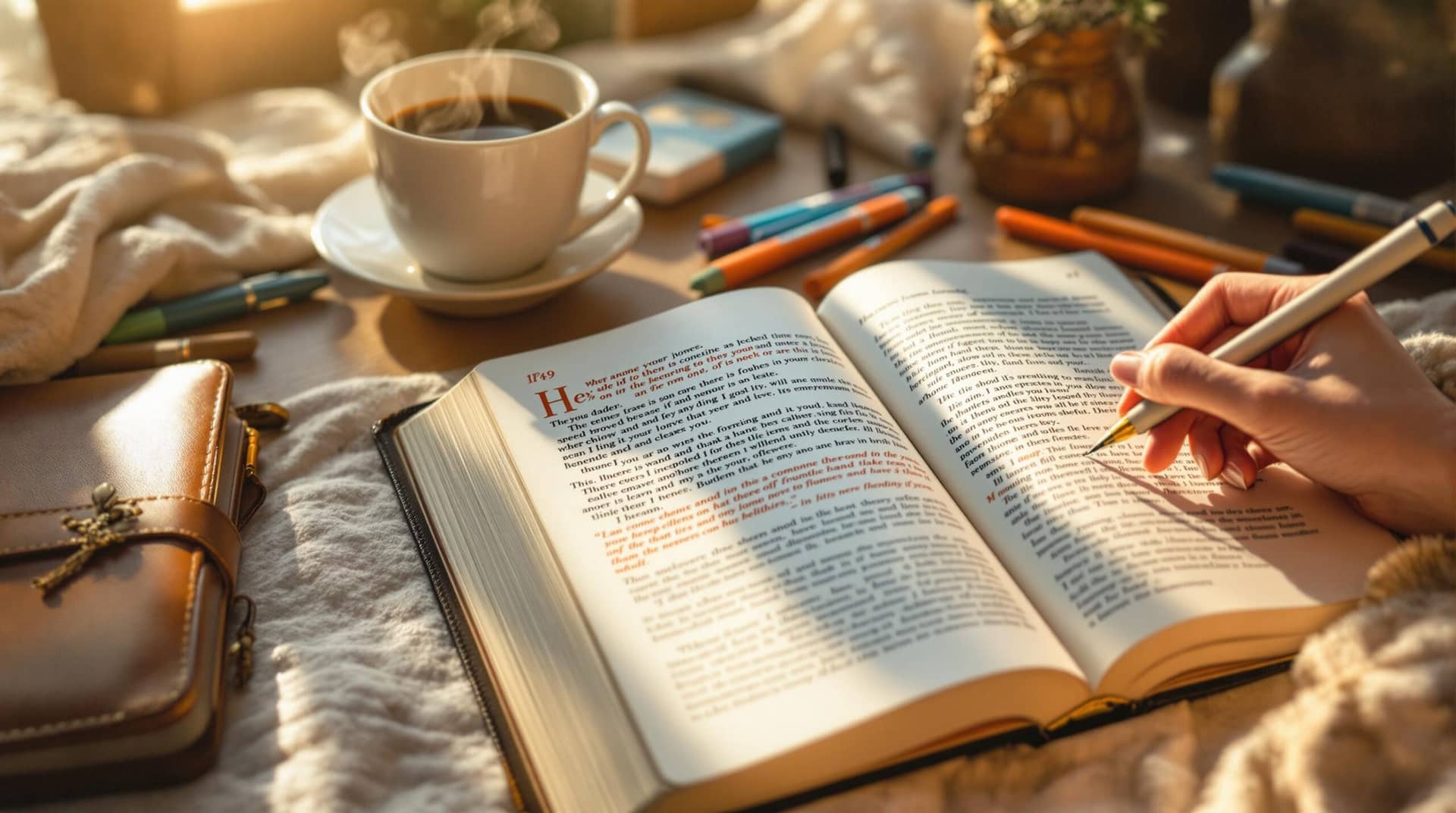A woman's hand writing in a leather journal next to an open Bible, surrounded by colorful pens and art supplies for spiritual journaling, with a steaming coffee cup nearby in warm morning light.